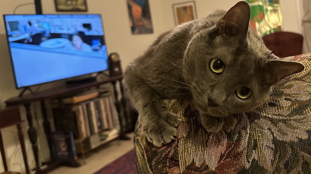 Whenever I leave the house and return a few hours later, Olga waits by the door to greet me. If I’m not paying attention to her when she wants to play, she’ll pull a paper ball from under the couch and hit it in my direction or leap on the windowsill and bat the blinds around. When I walk by her favorite scratching chair, and she’s in a wild mood, she’ll climb around it like a Lemur and play hide and seek by ducking her head behind the chair and popping it out.